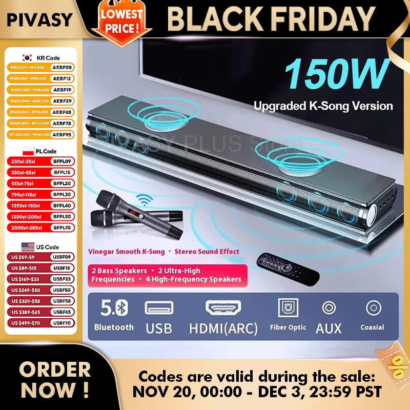 150W Karaoke Sound Bar With Wireless Mics 4 Bass Ports 55Hz Deep Bass DSP Audio Effects For Movies Music Singing