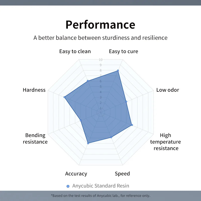 As the best-selling resin, standard resin delivers balanced performance in terms of printing success rate, stickiness with print bed, model details, printing precision, hardness, resilience, smell, fluidity and ease in cleaning.