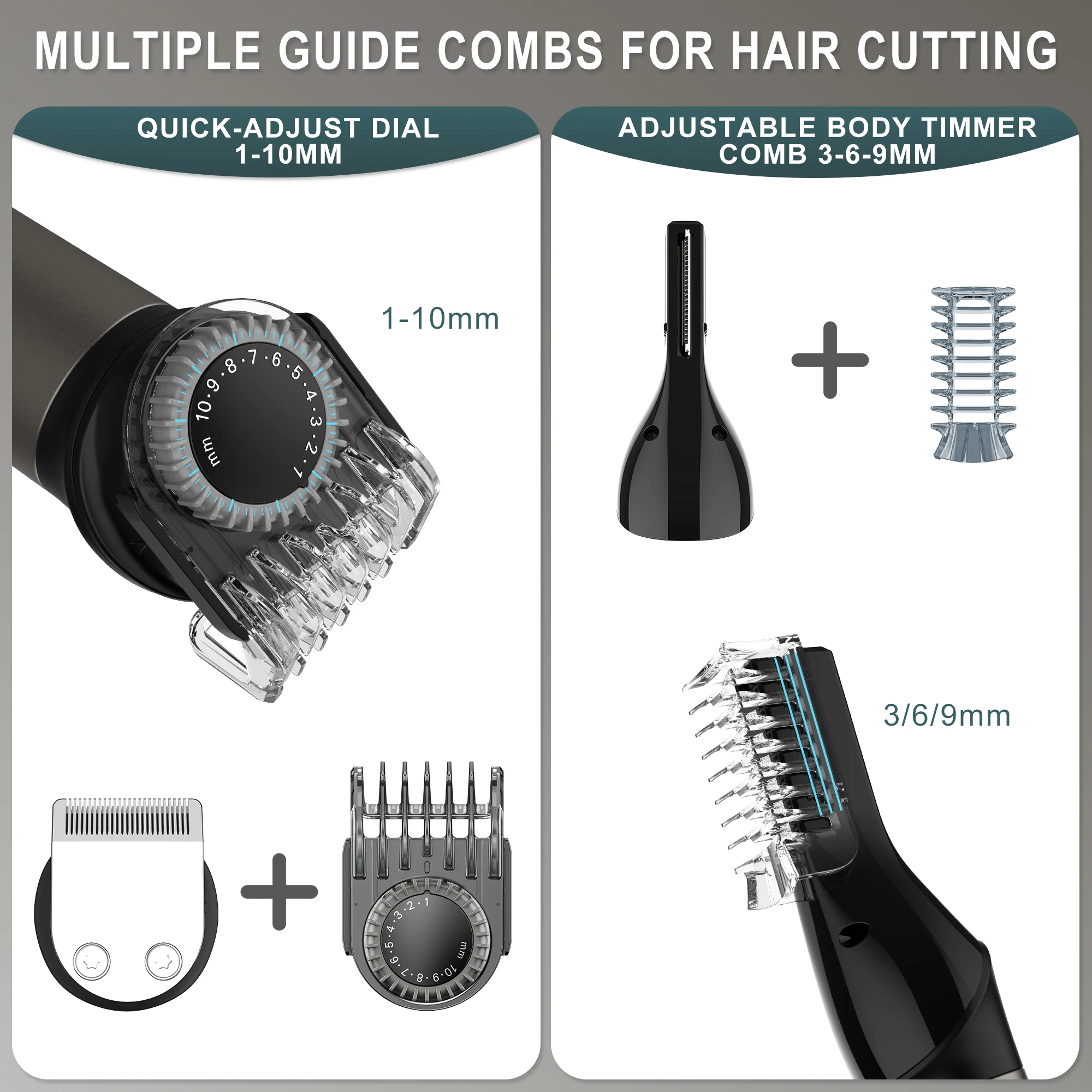 1.7-in-1 hair clipper: The set includes Body hair trimmer, precision trimmer, Design trimmer, Design trimmer, nose&ear trimmer, Durable trimmer blade, a set of products to meet your various hair trimming needs