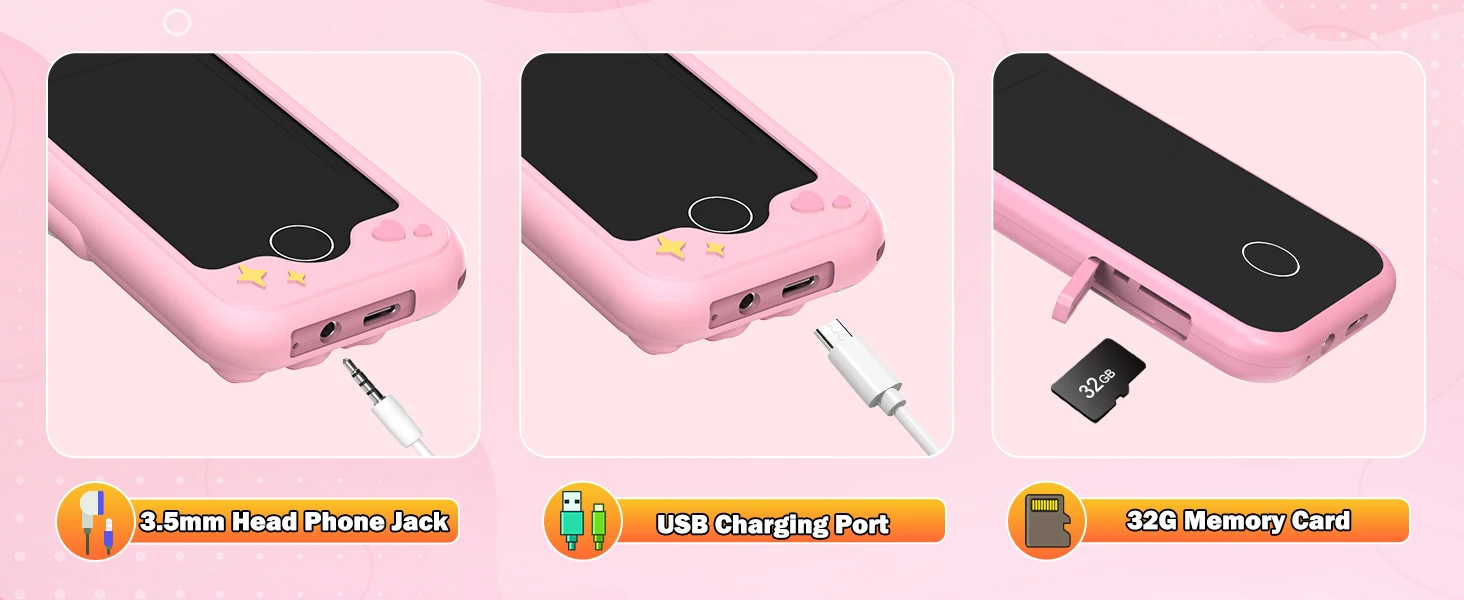 【Large Storage, Long Battery Life】 The toy phone comes with a USB cable and a built-in 600mAh rechargeable battery, which can be used by children for 4-5 hours a day. 32GB micro card to store thousands of photos. The device also features high-quality speakers and supports a 3.5mm headphone jack, making it good for kids to learn and enjoy music.