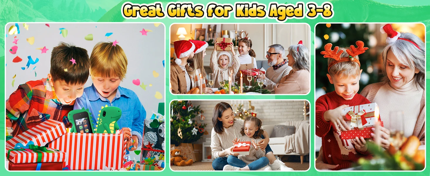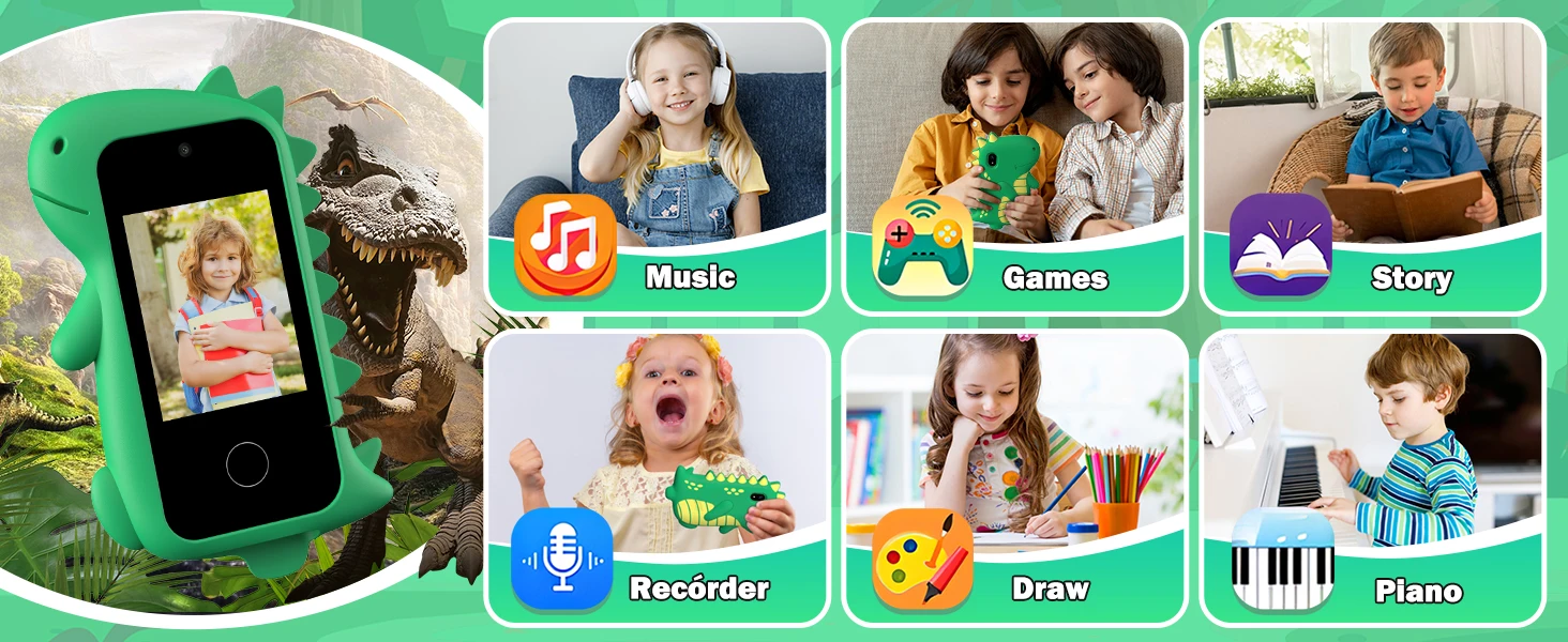 【Safe and Shock-Proof】This children's smartphone is made of high-quality non-toxic soft plastic, safe and comfortable for children's skin. The dinosaur animal pattern shockproof shell can effectively prevent falls.
