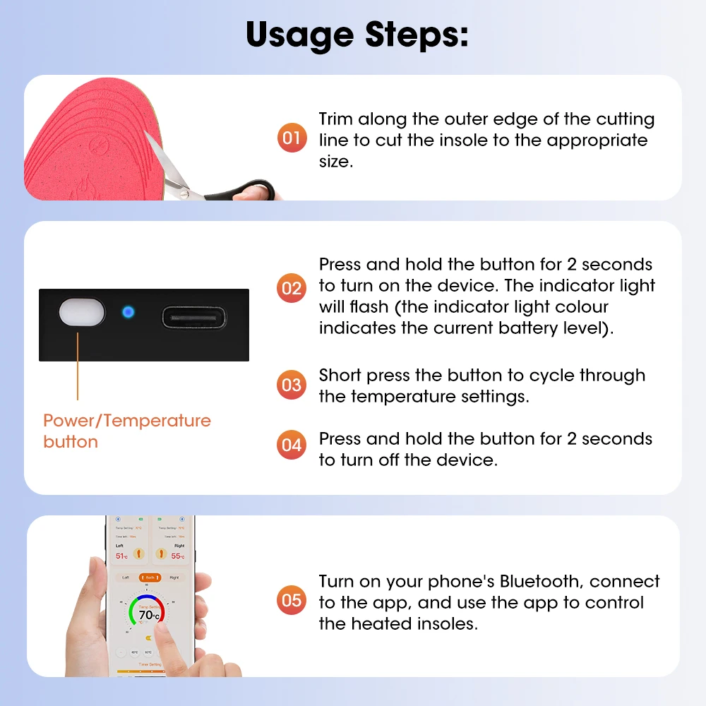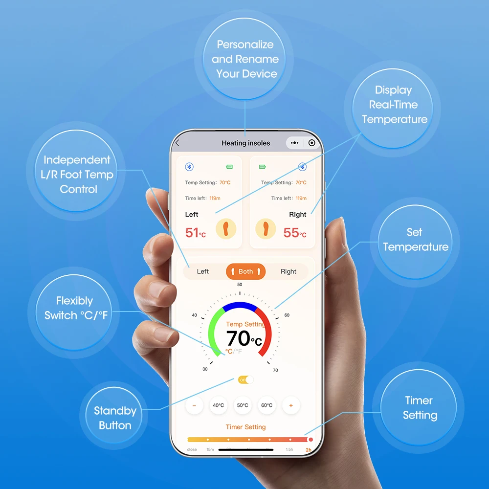 5. Through the dedicated and upgraded app on your mobile phone, these trimmable heating insoles can independently control the temperature of the left, right, and both feet; provide real-time temperature monitoring; and offer 15–120 minute timers for personalized warmth management.