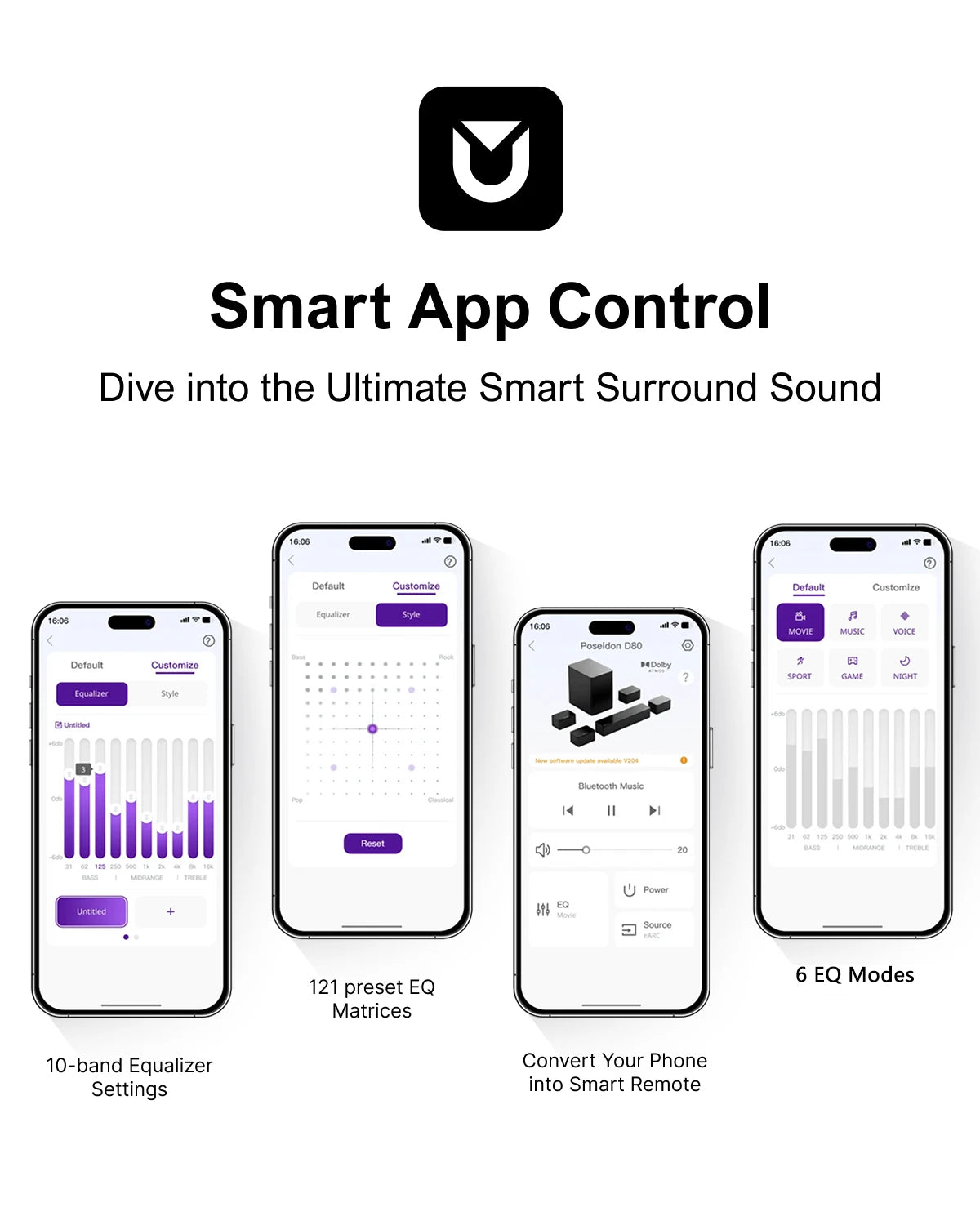 Take control with the Ultimea Smart App. Customize your audio settings, switch between your favorite sound profiles, and enjoy regular OTA updates that ensure your soundbar stays ahead of the curve.