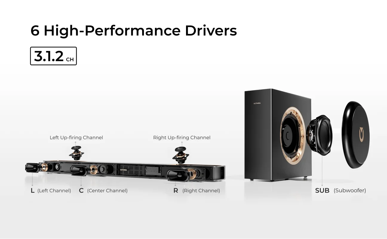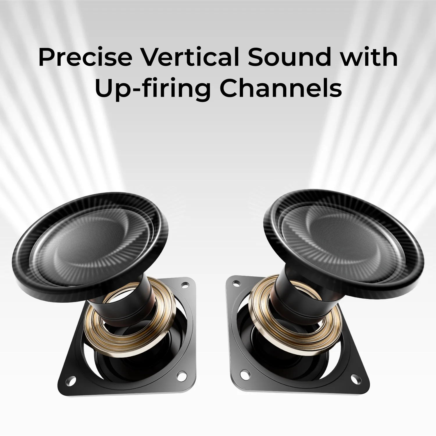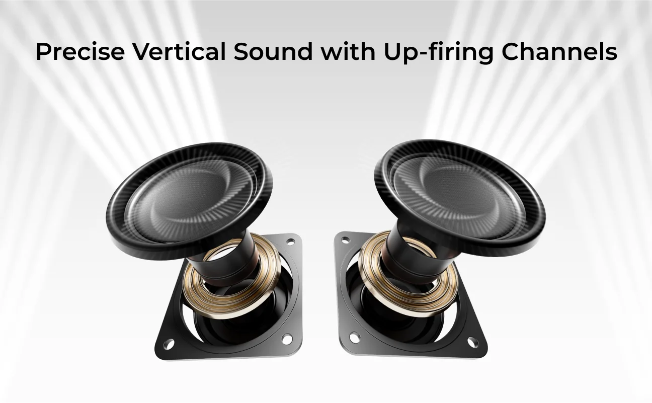 Experience room-filling, multidimensional sound with a true 3.1.2-channel setup. Featuring front-firing drivers, two up-firing speakers, and a powerful 5.25" wired subwoofer, the system creates a vertical sound field—no rear speakers required. From thunder roaring above to raindrops falling around you, feel the sound come alive.